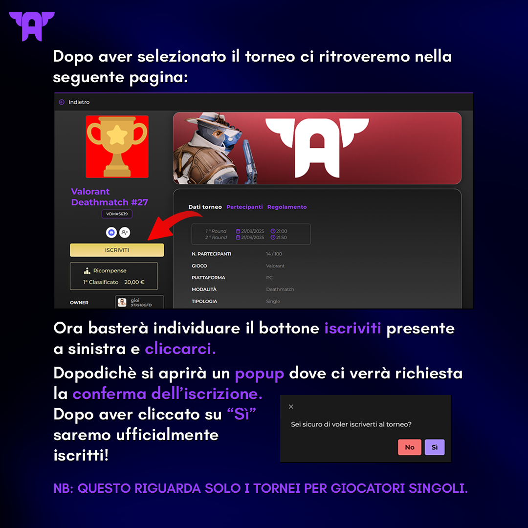 Per iscriversi al torneo basterà scegliere quello desiderato nella home, tramite il tasto "dettagli" entrare nella pagina di dettagli del torneo e cliccare il pulsante "Iscriviti".