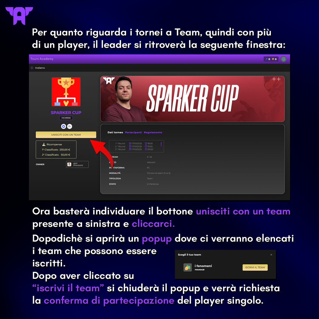 Per poter partecipare ad un qualunque torneo in modalità team è necessario che il proprietario del team o una persona dello stesso con il ruolo "admin" scelga il torneo desiderato dalla home, entri nella schermata di dettaglio e clicchi "Unisciti con un team".