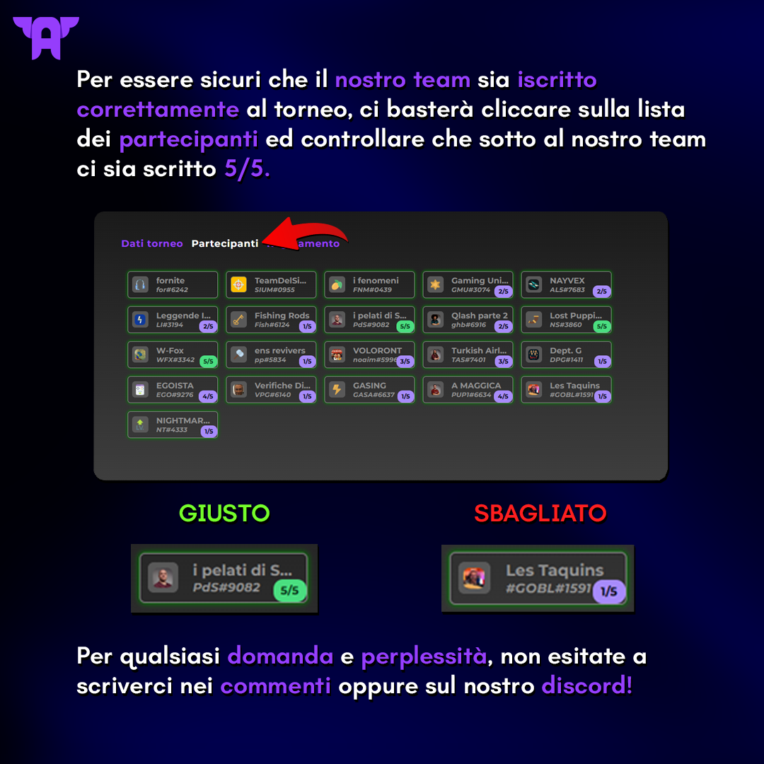 IMPORTANTE: In piattaforma per avere lo slot riservato dovete avere il team iscritto e tutti i membri confermati, finché non vedete la vignetta verde il vostro team non ha lo slot riservato. Solo i team verdi vengono contati nei team effettivamente partecipanti al torneo. Se per esempio un torneo ha massimo 16 slot team disponibili, potrebbero iscriversi anche più di 16 team, ma solo i primi 16 confermati in verde prenotano lo slot e possono partecipare.